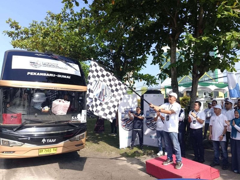 Pemimpin Wilayah Pegadaian Kanwil II Pekanbaru Eko Supriyanto (Baju Putih) melepas keberangkatan mudik gratis bersama Pegadaian, Kamis (27/3/2025) (Foto: IST)