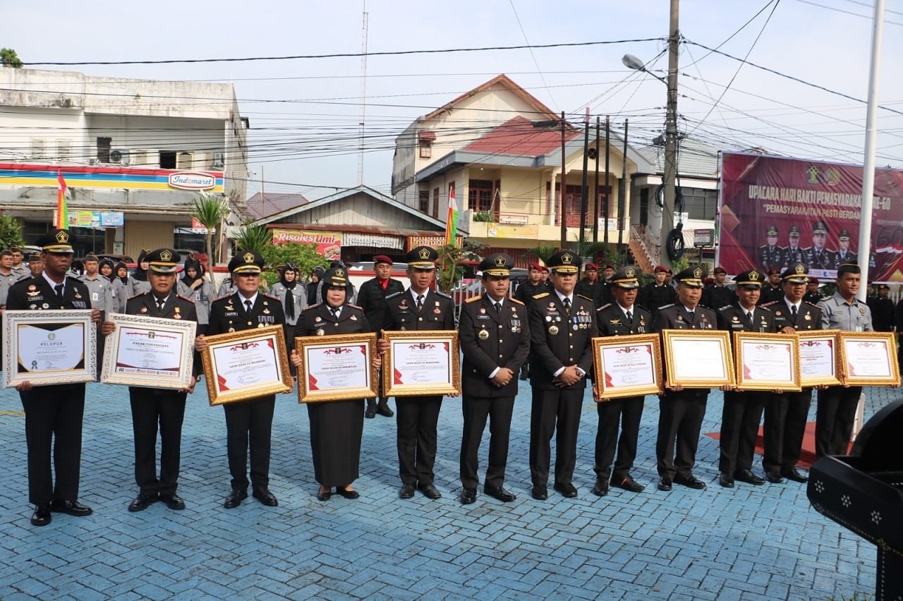 PEKANBARU, hitsnasional.com – Dalam rangka memperingati Hari Bakti Pemasyarakatan (HBP) ke-60, Kepala Kantor Wilayah Kementerian Hukum dan HAM Riau, Budi Argap Situngkir menyerahkan penghargaan kepada pegawai dan Unit Pelaksana Teknis berprestasi dan berdedikasi tinggi di lingkungan Kantor Wilayah Kementerian Hukum dan HAM Riau. Penyerahan penghargaan ini dilakukan saat upacara peringatan HBP yang digelar di lapangan Lembaga Pemasyarakatan Kelas IIA Pekanbaru, Sabtu (27/4/2024).
