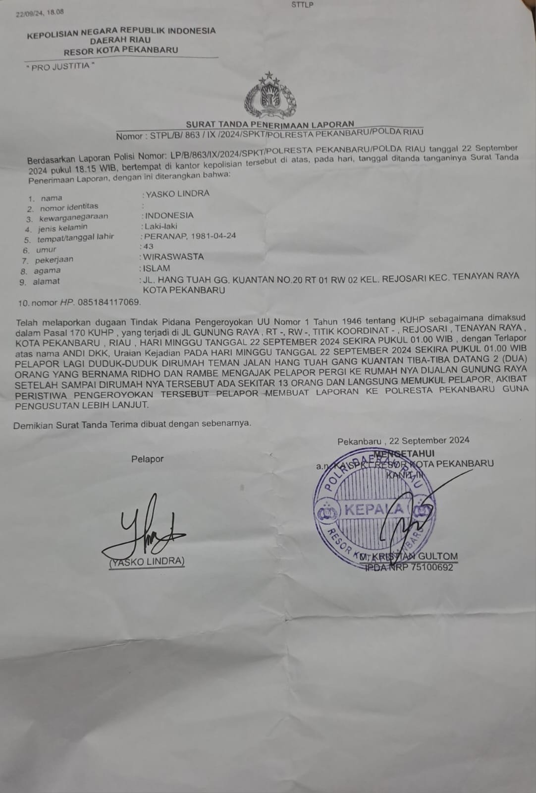 Laporan penganiayaan sebagaimana dimaksud dalam Pasal 170 KUHP tersebut resmi diterima Polresta Pekanbaru dengan Nomor: LP/B/863/IX/2024/SPKT/Polresta Pekanbaru/Polda Riau tertanggal 22 September 2024.