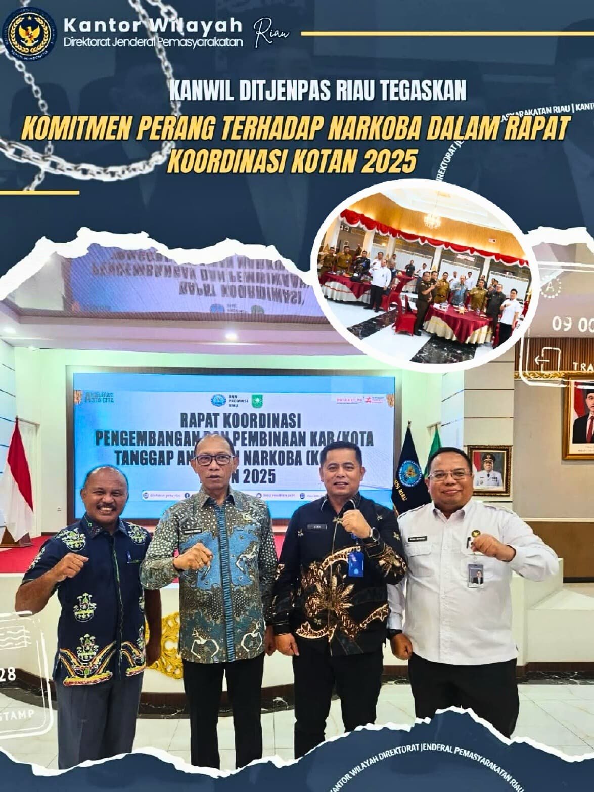 PEKANBARU, hitsnasional.com – Kantor Wilayah Direktorat Jenderal Pemasyarakatan Riau menegaskan komitmennya dalam upaya pemberantasan narkoba melalui keikutsertaannya dalam Rapat Koordinasi Pengembangan dan Pembinaan Kota/Kabupaten Tanggap Ancaman Narkoba (KOTAN) Provinsi Riau Tahun 2025, yang diselenggarakan pada di Gedung Pauh Janggi, Pekanbaru.