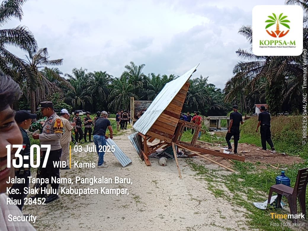 KAMPAR, hitsnasional.com – Pembongkaran sebuah pos keamanan milik Koperasi Perkebunan Sawit Mandiri (KOPPSA-M) yang terletak di Desa Pangkalan Baru, Kecamatan Siak Hulu, Kabupaten Kampar, memicu keberatan dari pihak koperasi. Peristiwa yang terjadi pada Kamis, 3 Juli 2025, tersebut dilakukan oleh sekelompok orang yang disebut dikawal personel berseragam dan bersenjata lengkap.