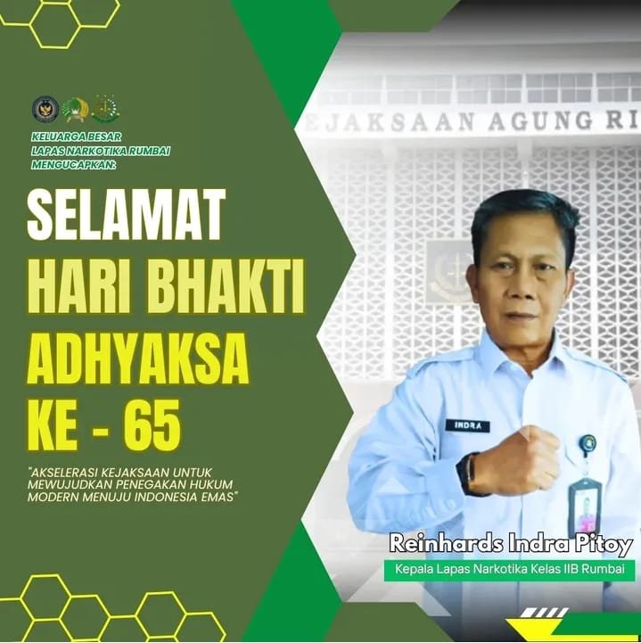 PEKANBARU, hitsnasional.com – Dalam momentum Hari Bhakti Adhyaksa ke-65, Lembaga Pemasyarakatan (Lapas) Narkotika Kelas IIB Rumbai menyampaikan ucapan selamat dan apresiasi kepada seluruh jajaran Kejaksaan Republik Indonesia atas dedikasi dan pengabdiannya dalam menegakkan hukum di Indonesia.