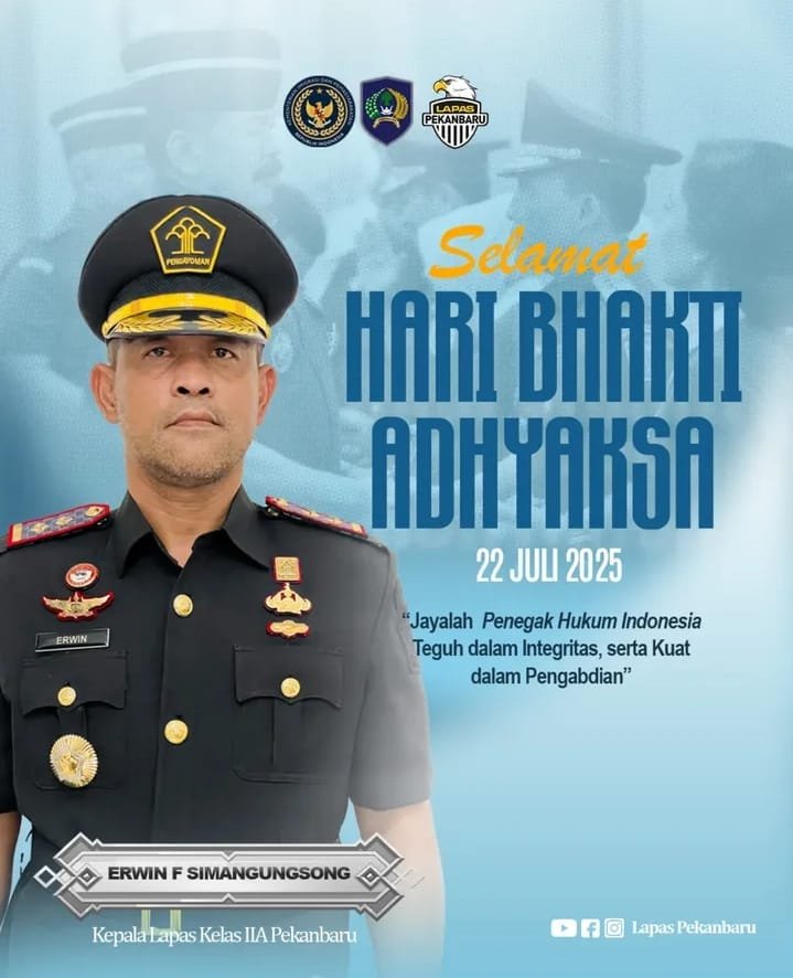 PEKANBARU, hitsnasional.com – Kepala Lembaga Pemasyarakatan (Lapas) Kelas IIA Pekanbaru, Erwin F. Simangunsong, memberikan ucapan selamat memperingati Hari Bhakti Adhyaksa ke-64 yang jatuh pada hari Selasa, 22 Juli 2025.