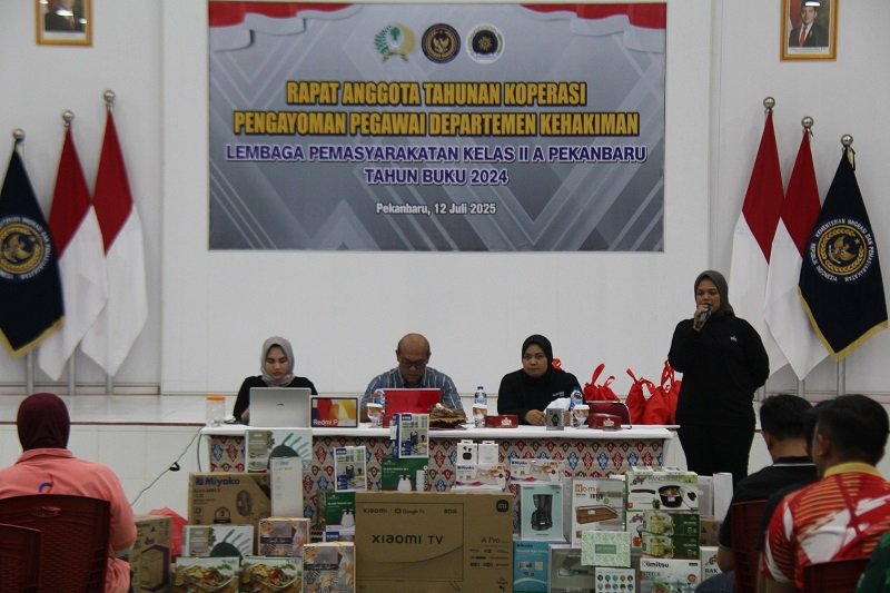PEKANBARU, hitsnasional.com – Seluruh pegawai Lembaga Pemasyarakatan (Lapas) Kelas IIA Pekanbaru mengikuti kegiatan Rapat Anggota Tahunan (RAT) Tahun Buku 2024 yang digelar di Aula Sahardjo Lapas Pekanbaru, Sabtu (12/7/2025). Kegiatan ini dihadiri oleh Pembina Koperasi yang juga menjabat sebagai Kepala Lapas Pekanbaru, Erwin Fransiskus Simangunsong, serta diikuti oleh ketua, pengurus, pengawas, dan anggota Koperasi Pegawai Lapas Pekanbaru.