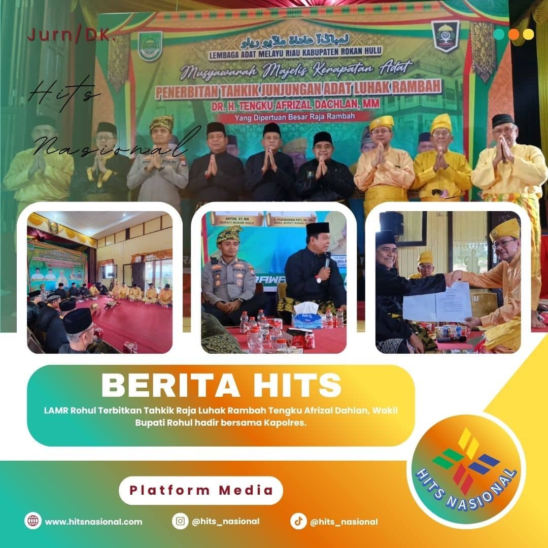 Rokan Hulu, hitsnasional.com – Lembaga Adat Melayu Riau (LAMR) Kabupaten Rokan Hulu (Rohul) secara resmi menerbitkan Tahkik Junjungan Adat Luhak Rambah untuk Raja Luhak Rambah, Tengku Afrizal Dahlan, M.M. Acara yang berlangsung pada Sabtu, 4 Oktober 2025 di Gedung Balai Adat LAMR Rohul ini dihadiri langsung oleh Wakil Bupati Rohul, H. Syafaruddin Poti, SH, M.M, didampingi Kapolres Rohul AKBP Emil Eka Putra, serta sejumlah pejabat daerah dan tokoh adat setempat.