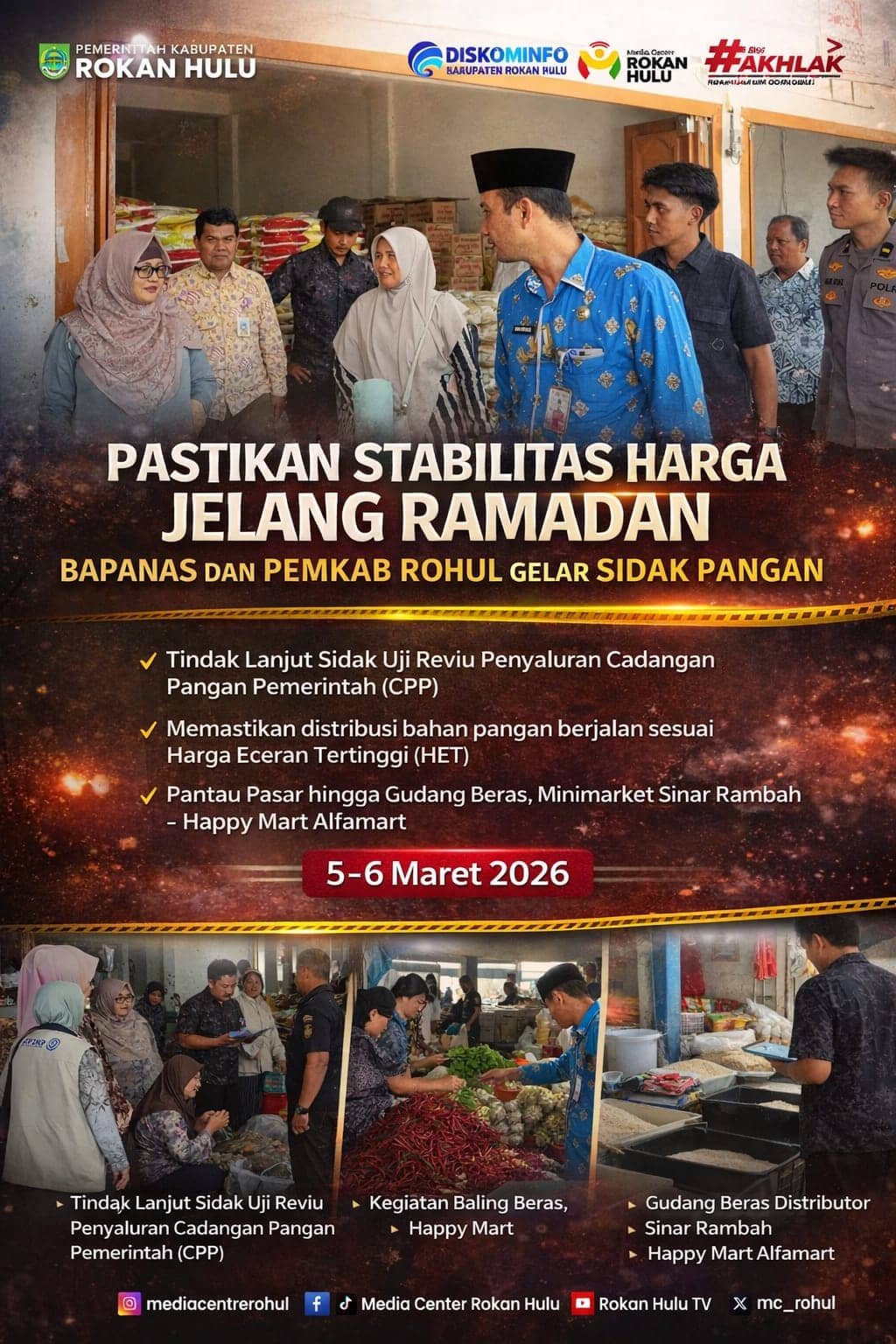 Kadis DKPP Zulfikar, SP menyebutkan Sidak gabungan ini bertujuan melakukan validasi lapangan terhadap kepatuhan pelaku usaha mengenai Harga Eceran Tertinggi (HET) dan Harga Acuan Pasar (HAP). Hari Pertama Tim menyasar lini distributor dan retail besar. Pemeriksaan dilakukan di gudang Distributor Beras Sinar Rambah, Swalayan Happy Mart, hingga gerai Alfamart untuk memastikan rantai pasok dari hulu ke hilir tetap sesuai regulasi.