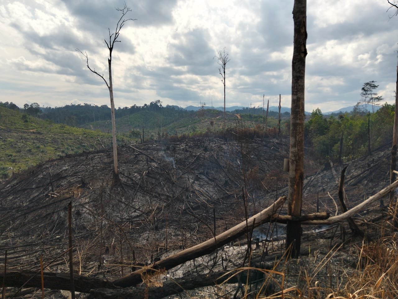 Dari hasil penelusuran dan pengecekan ke lokasi oleh tim media, di dapati sebagian besar dari lahan Hutan Desa Pemandang terbakar atau dibakar oleh oknum yang tidak bertanggung jawab, terpantau di lapangan lahan yang sudah di pasangi tapal batas dan yang sudah reboisasi juga habis dimakan api. (Tim Media Investigasi)