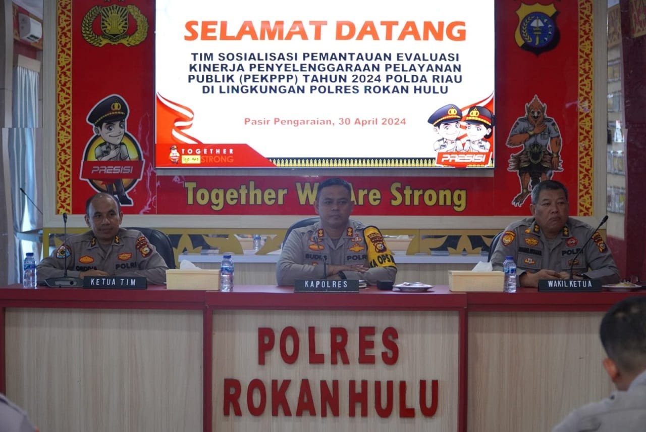 ROKAN HULU, hitsnasional.com – Polda Riau adakan Sosialisasi Pemantauan Evaluasi Kinerja Penyelenggaraan Pelayanan Publik (PEKPPP) Tahun 2024 , Selasa tanggal 30 April 2024 pukul 09.30 Wib bertempat di Ruang Rupatama Polres Rokan Hulu.