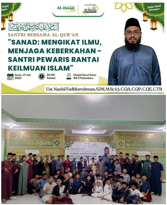 PEKANBARU, hitsnasional.com – Dalam rangka memperkuat semangat keilmuan dan spiritualitas santri, Al-Ihsan Boarding School 2 Pekanbaru akan menggelar kajian istimewa bertajuk “Sanad: Mengikat Ilmu, Menjaga Keberkahan Santri Pewaris Rantai Keilmuan Islam”, pada Senin malam, 21 Juli 2025, bertempat di Masjid Darul Ihsan IBS 2 Pekanbaru.