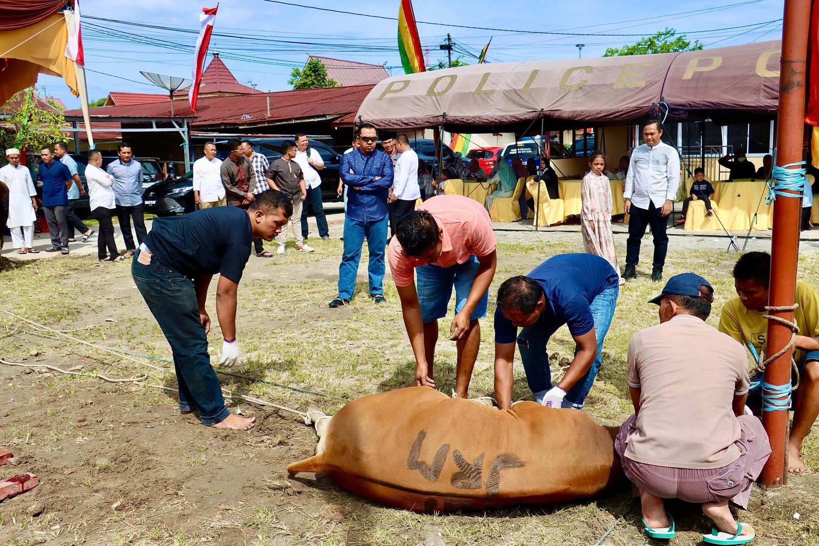 Pantauan, pemotongan hewan qurban Kapolresta Pekanbaru Kombes Pol Jeki Rahmat Mustika.,S.IK., Wakapolresta Pekanbaru Akbp Henky Poerwanto.,S.IK.,MM dan pemotongan hewan qurban Kabag SDM Polresta Pekanbaru Kompol Wahariyana dan peserta qurban lain nya dilaksanakan oleh panitia qurban.