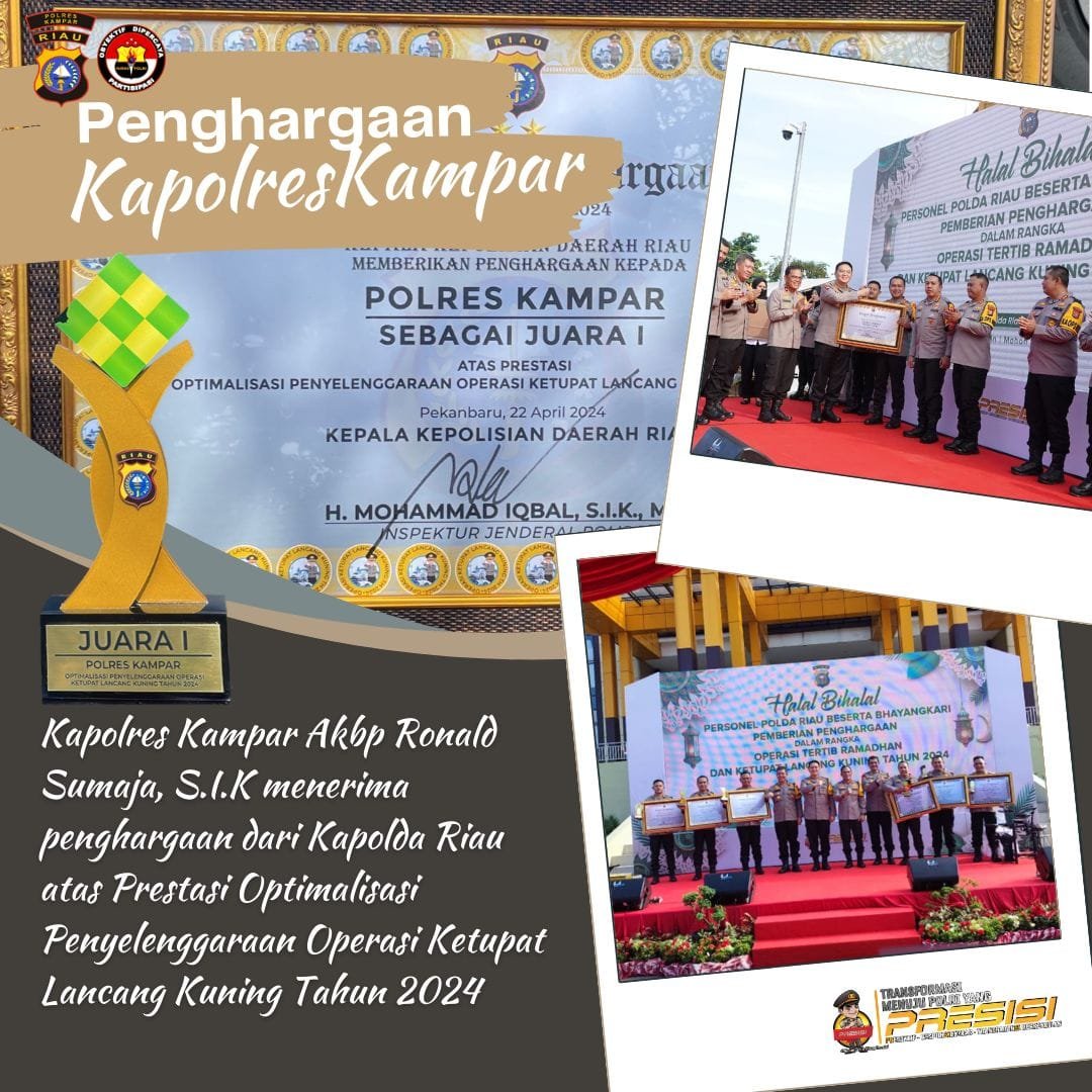 KAMPAR, hitsnasional.com – Polres Kampar menerima penghargaan dari Kapolda Riau atas prestasi dan kesuksesan dalam melaksanakan Operasi Tertib ramadhan lancang kuning dan Operasi Ketupat Lancang Kuning 2024.
