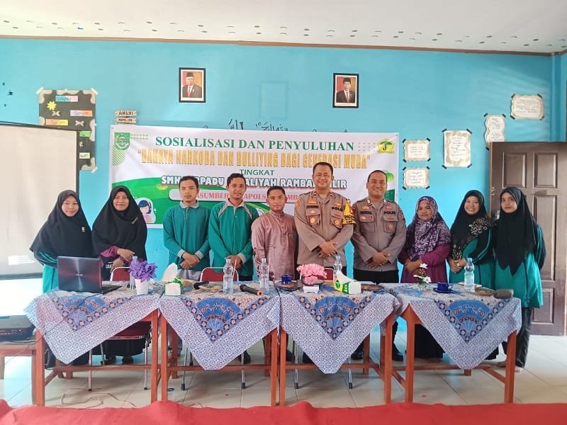RAMBAH HILIR (ROHUL), hitsnasional.com – Untuk mencegah terjadinya penyalahgunaan Narkoba sejak usia dini serta perilaku Bullying antar siswa, Kapolsek Rambah Hilir IPDA Jonnes laksanakan giat Sosialisasi Bahaya Penyalah gunaan Narkoba dan Bullying di SMK Terpadu Ismailiyah Kecamatan Rambah Hilir Kabupaten Rohul, Jumat (13/12/2024).