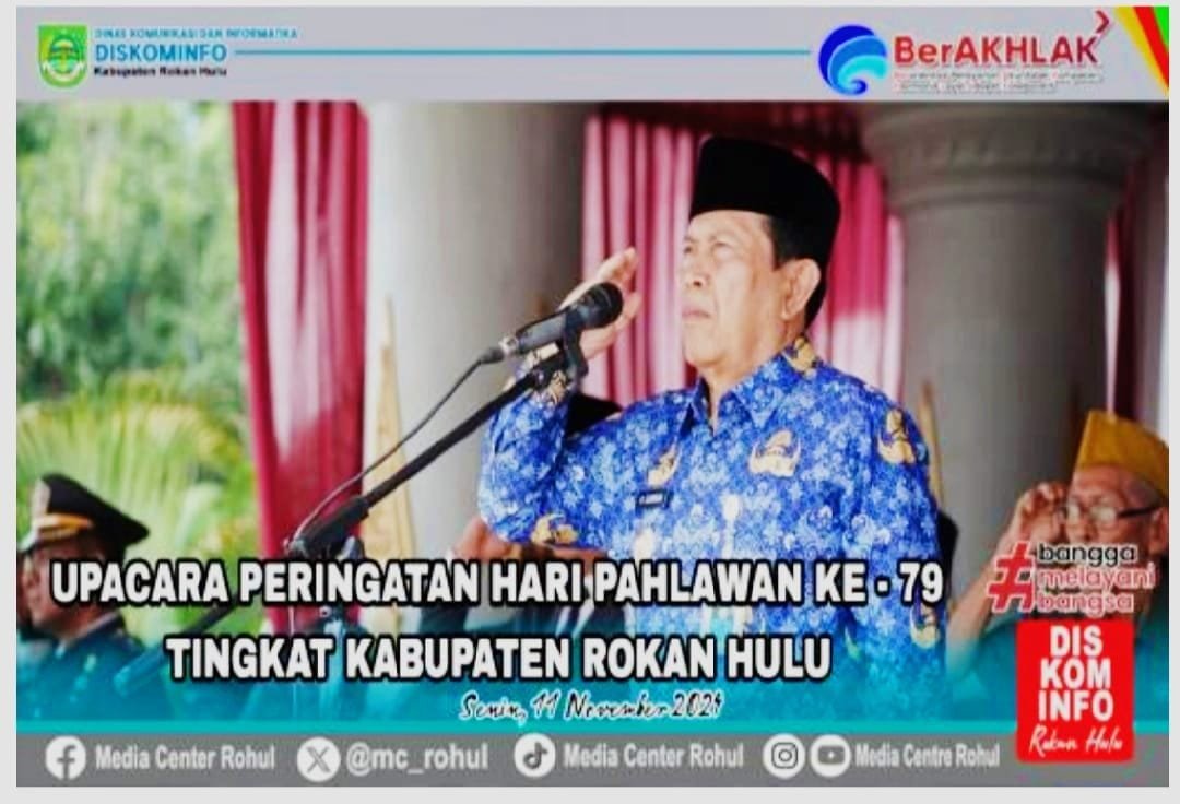 sumbangsih yang berarti bagi kemajuan bangsa Indonesia. Bupati Rohul juga menyampaikan proses perjuangan membangun bangsa senantiasa berbeda setiap tahunnya, hal ini terkait pergantian strategis dimana pada setiap masa akan berbeda tantangan, peluang, kekuatan dan keterbatasannya. “Dulu implementasi kepahlawanan adalah dengan semangat mendobrak, menjebol dan meruntuhkan kolonialisme penjajah, maka saat ini implementasinya adalah meruntuhkan struktur dan kultur kemiskinan dan kebodohan yang menjadi akar masalah pada bangsa ini,” ucap sukiman.