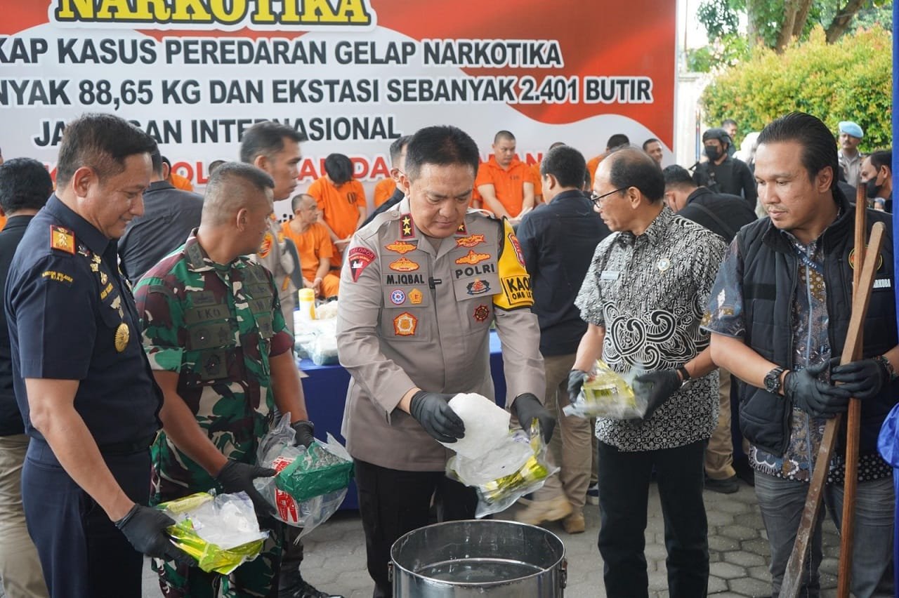 PEKANBARU, hitsnasional.com – Polda Riau melaksanakan pemusnahan barang bukti narkotika hasil pengungkapan dari jaringan internasional, Jumat (26/4/2024). Barang bukti yang dimusnahkan yakni 88,65 kilogram sabu dan 2.401 butir pil ekstasi.