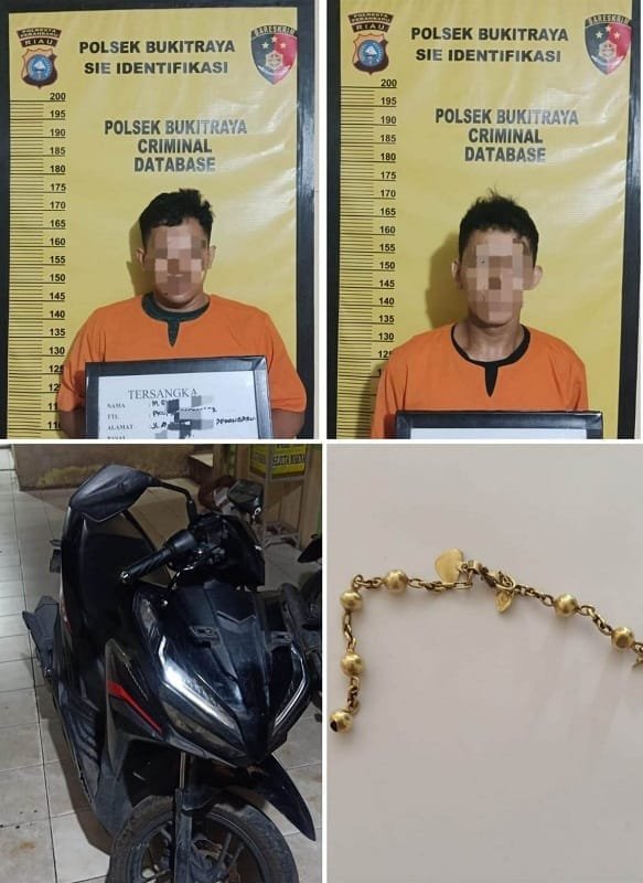 Setelah di lakukan penggeledahan dan mengamankan barang bukti, tim selanjutnya membawa ke dua pelaku beserta barang bukti berupa 1 (satu) unit Sepeda motor merk Honda Vario warna Hitam dengan nomor polisi Palsu BM 6014 YX dan 1 (satu) buah gelang rantai emas ke Polsek Bukit Raya untuk penanganan lebih lanjut.