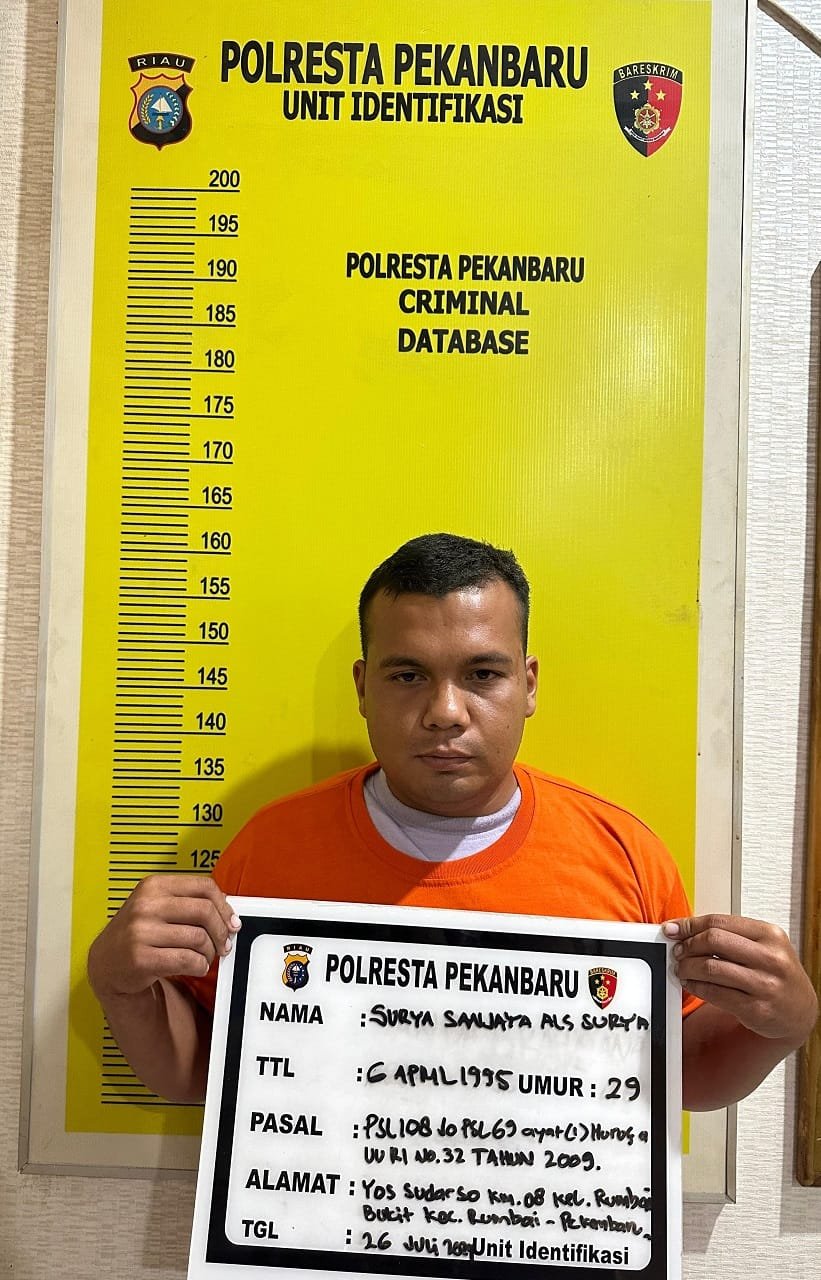 Dari hasil pemeriksaan, Surya ditetapkan sebagai tersangka dan dijerat dengan Pasal 108 Jo Pasal 69 ayat (1) Huruf a UU No 32 Tahun 2009 tentang Perlindungan dan Pengolahan Lingkungan Hidup. Ia kini ditahan di Mapolresta.