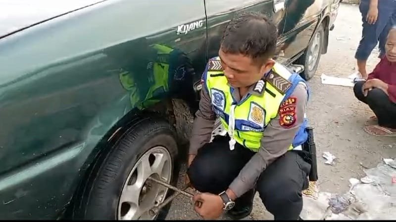 Sigap, Polantas Polsek Tualang Bantu Pemudik Alami Bocor Ban