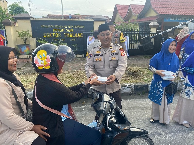 Sebanyak 300 paket takjil yang terdiri atas makanan dan minuman telah disiapkan untuk dibagikan kepada masyarakat Kecamatan Tualang. Kegiatan ini dipimpin oleh Panit Binmas Ipda Sugeng Mishari, S.H., bersama sejumlah personel Polsek Tualang. Turut hadir pula Ketua Badan Kontak Majelis Taklim (BKMT) Kecamatan Tualang, Hj. Sopiah Wati, S.Pd., beserta pengurus lainnya.
