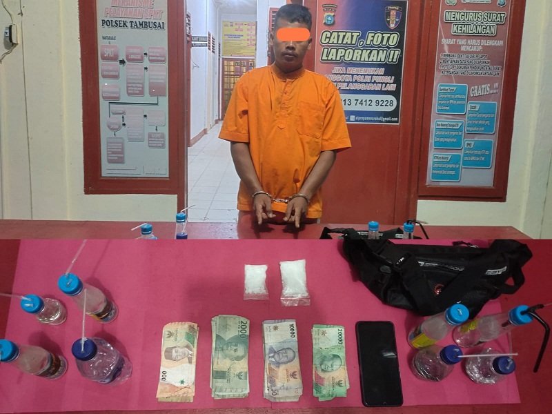 Dari hasil penggeledahan di lokasi kejadian, petugas menemukan sejumlah barang bukti yang menguatkan dugaan tindak pidana narkotika. Barang bukti yang diamankan antara lain, 2 (dua) bungkus narkotika jenis sabu, uang tunai Rp 589.000, 3 (tiga) bungkus plastik bening besar berisi plastik bening kecil kosong, 8 (delapan) buah bong dari botol aqua dan Lasegar beserta pipet bengkok, 7 (tujuh) mancis, 3 (tuga) unit handphone (2 hp oppo dan 1 hp Realme), 2 (dua) tas pinggang, 3 (tuga) kaca pirex dan 8 (delapan) unit sepeda motor. Kesembilan orang yang diamankan beserta barang bukti kemudian dibawa ke Polsek Tambusai untuk pemeriksaan lebih lanjut.