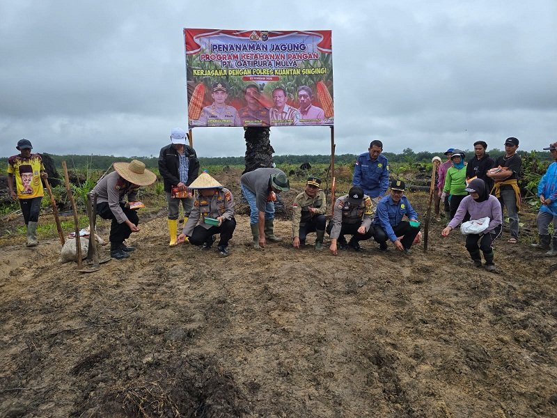 KUANTAN SINGINGI, hitsnasional.com – Dalam rangka mendukung Program Ketahanan Pangan Nasional yang menjadi bagian dari Program Asta Cita Presiden RI, Polsek Pangean bersama PT. Gatipura Mulya melaksanakan kegiatan penanaman jagung pipil di lahan tumpang sari milik perusahaan di Desa Sungai Langsat, Kecamatan Pangean, Kabupaten Kuantan Singingi. Kegiatan ini berlangsung pada Kamis, (27/2/2025), mulai pukul 10.00 WIB.