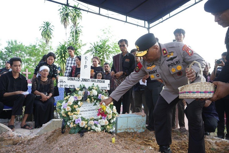 PEKANBARU, hitsnasional.com – Jenazah Iptu (Anumerta) Donald Junus Halomoan, personel Brimob Polda Riau yang gugur saat bertugas memadamkan kebakaran hutan dan lahan (karhutla) di Kabupaten Rokan Hilir, dimakamkan secara kedinasan pada Kamis (7/8/2025) sore.