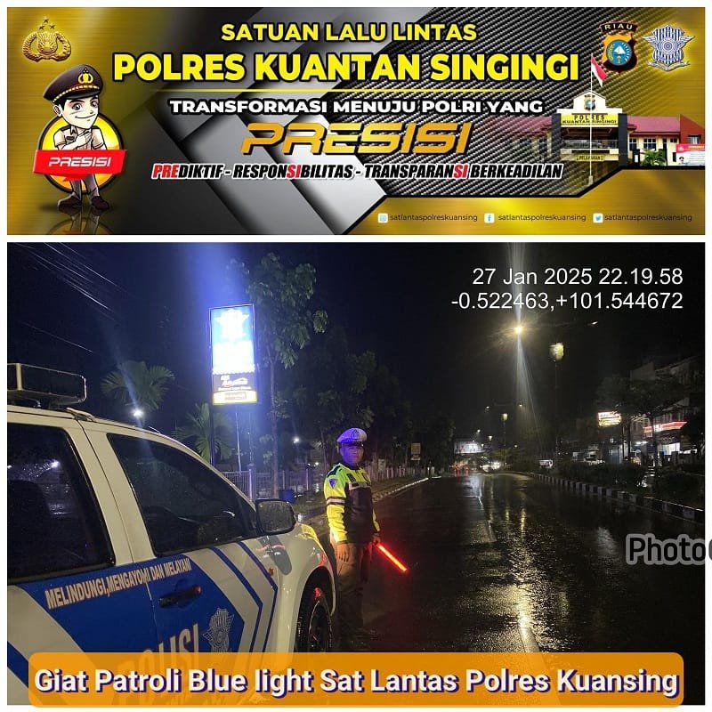 KUANTAN SINGINGI, hitsnasional.com – Sat Lantas Polres Kuantan Singingi (Kuansing) kembali menggelar patroli rutin Blue Light untuk memantau arus lalu lintas, mengantisipasi daerah rawan kecelakaan lalu lintas (laka lantas), aksi balap liar, serta tindak kriminalitas seperti pencurian dengan kekerasan (Curas), pencurian dengan pemberatan (Curat), dan pencurian kendaraan bermotor (Curanmor). Patroli ini dilaksanakan pada Senin malam (27/1/2025), mulai pukul 21.00 WIB hingga selesai.