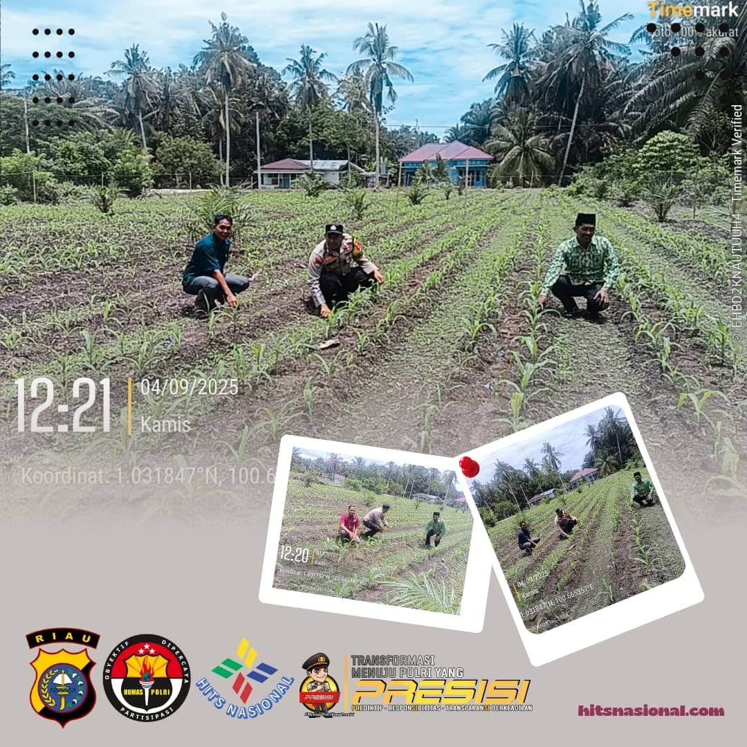 Kunto Darussalam|Rohul, hitsnasional.com – Bhabinkamtibmas Polsek Kunto Darussalam Desa Pasir Luhur, Bripka Ricardo Sibarani bersama perangkat desa melakukan pengecekan perkembangan tanaman jagung di lahan Program Nomor 2 Ketahanan Pangan Monokultur, Kamis (04/09/2025) sekitar pukul 10.00–12.00 WIB.