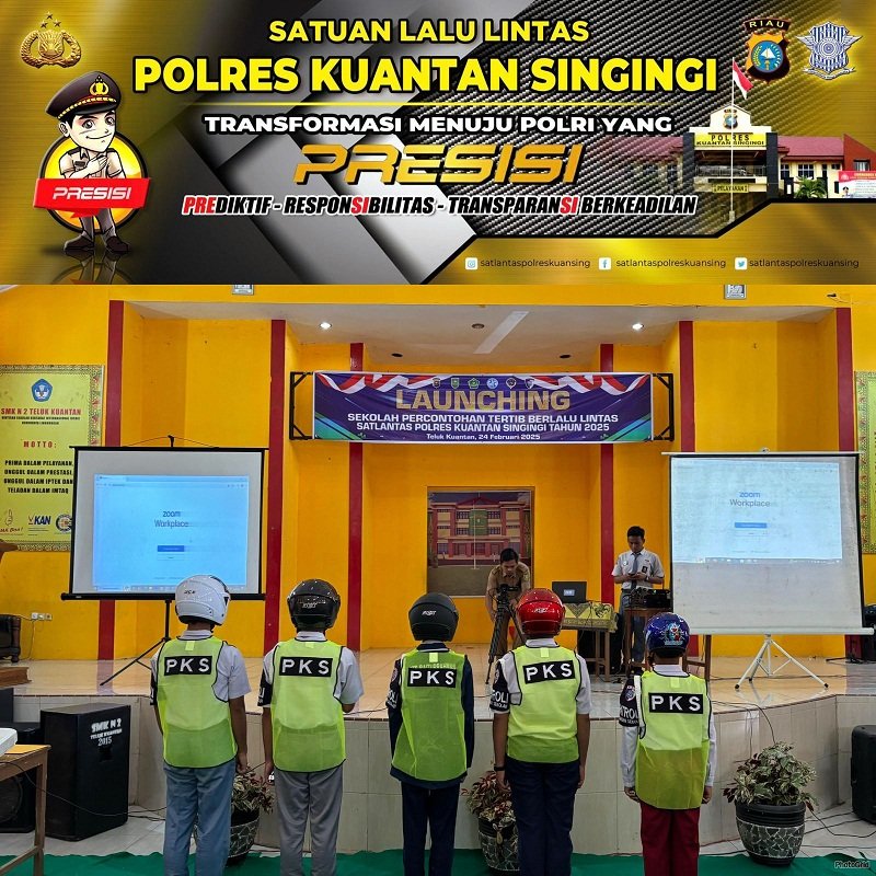KUANTAN SINGINGI, hitsnasional.com – Dalam upaya meningkatkan kesadaran tertib berlalu lintas di kalangan pelajar, Polres Kuantan Singingi (Kuansing) mengikuti kegiatan Zoom Meeting Launching Sekolah Tertib Berlalu Lintas se-Polda Riau pada Senin, (24/2/2025 pukul 13.30 WIB di SMKN 2 Teluk Kuantan. Kegiatan ini dihadiri oleh berbagai pihak, termasuk pejabat dari Polres Kuansing, instansi terkait, kepala sekolah, serta perwakilan siswa-siswi dari beberapa sekolah di Kuansing.