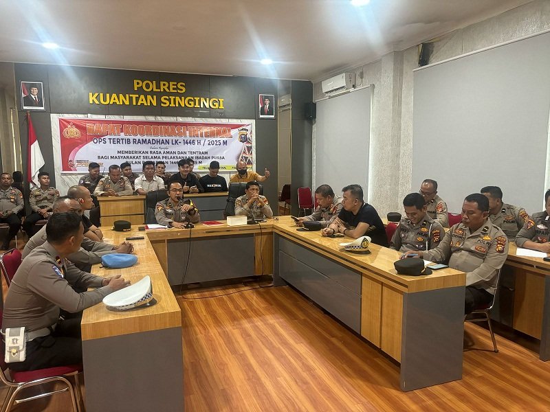 KUANTAN SINGINGI, hitsnasional.com – Dalam rangka menjaga keamanan dan ketertiban masyarakat selama bulan suci Ramadhan 1446 H/2025 M, Polres Kuantan Singingi (Kuansing) menggelar Rapat Koordinasi Internal Operasi Tertib Ramadhan Lancang Kuning (LK)-1446 H/2025 M. Kegiatan ini bertujuan untuk memastikan pelaksanaan ibadah puasa berlangsung dengan aman dan tenteram bagi masyarakat.