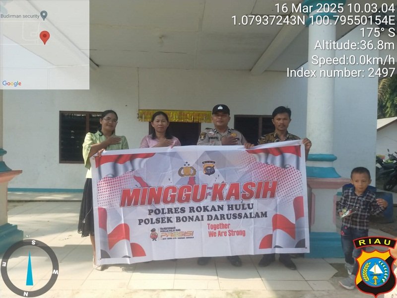 BONAI DARUSSALAM (ROKAN HULU), hitsnasional.com – 16 Maret 2025, Dalam rangka menciptakan situasi yang aman dan kondusif bagi masyarakat yang menjalankan ibadah, Polsek Bonai Darussalam melaksanakan patroli dan pengamanan di Gereja Oikumene PT. Andika Permata Sawit Lestari (APSL), Desa Sontang, Kecamatan Bonai Darussalam, Kabupaten Rokan Hulu, Minggu (16/3/25).