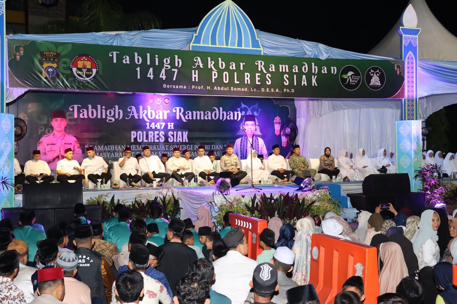 SIAK, hitsnasional.com – Lapangan Apel Polres Siak dipadati ratusan jamaah pada Jumat (20/2/2026) malam. Sekira pukul 21.00 WIB, kegiatan Tabligh Akbar Ramadhan 1447 H Polres Siak digelar dengan menghadirkan dai nasional, Ustadz Prof. Dr. H. Abdul Somad Batubara, Lc., D.E.S.A., Ph.D (UAS), mengangkat tema “Ramadhan Memperkuat Sinergi Polri dan Masyarakat Dalam Menjaga Kamtibmas.”