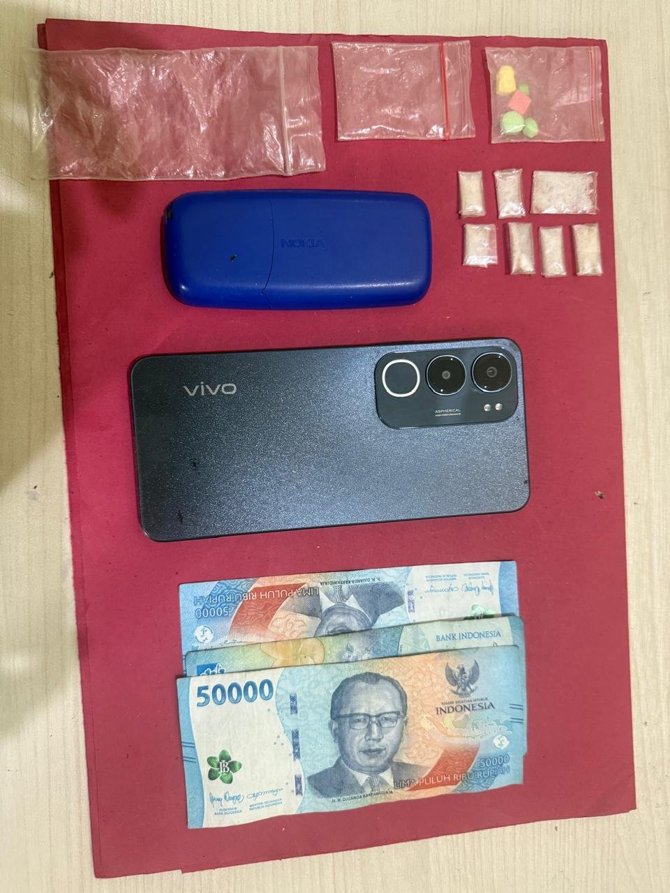 Hasil penyelidikan membuahkan hasil. Pada Selasa siang, tim berhasil mengamankan seorang laki-laki berinisial K (49 Tahun), warga Desa Sontang, yang saat itu berusaha melarikan diri. Dari hasil penggeledahan badan, petugas menemukan barang bukti berupa 7 paket kecil diduga narkotika jenis sabu dengan berat kotor 2,47 gram, 4 butir pil ekstasi, dua unit telepon genggam, plastik klip bening, serta uang tunai sebesar Rp630.000,- yang diduga hasil transaksi narkotika.