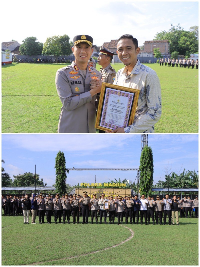 MADIUN (JAWA TIMUR), hitsnasional.com – Dalam upaya memperkuat ketahanan pangan di wilayah Kabupaten Madiun, Polres Madiun memberikan penghargaan kepada Pimpinan Perum Bulog Cabang Madiun, Agung Sarianto, atas dedikasi dan kontribusinya. Penghargaan ini diserahkan dalam apel pagi di Lapangan Tribrata Polres Madiun, Kamis (29/1/2026).